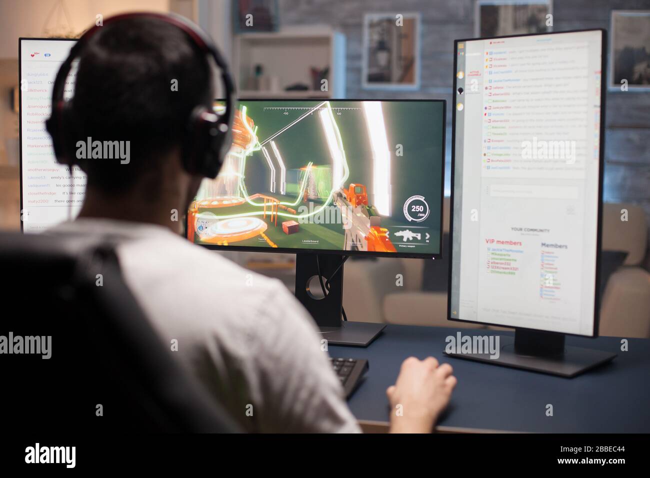 Back View Of Young Man Playing Video Games On Computer With Multiple Monitors Stock Photo Alamy